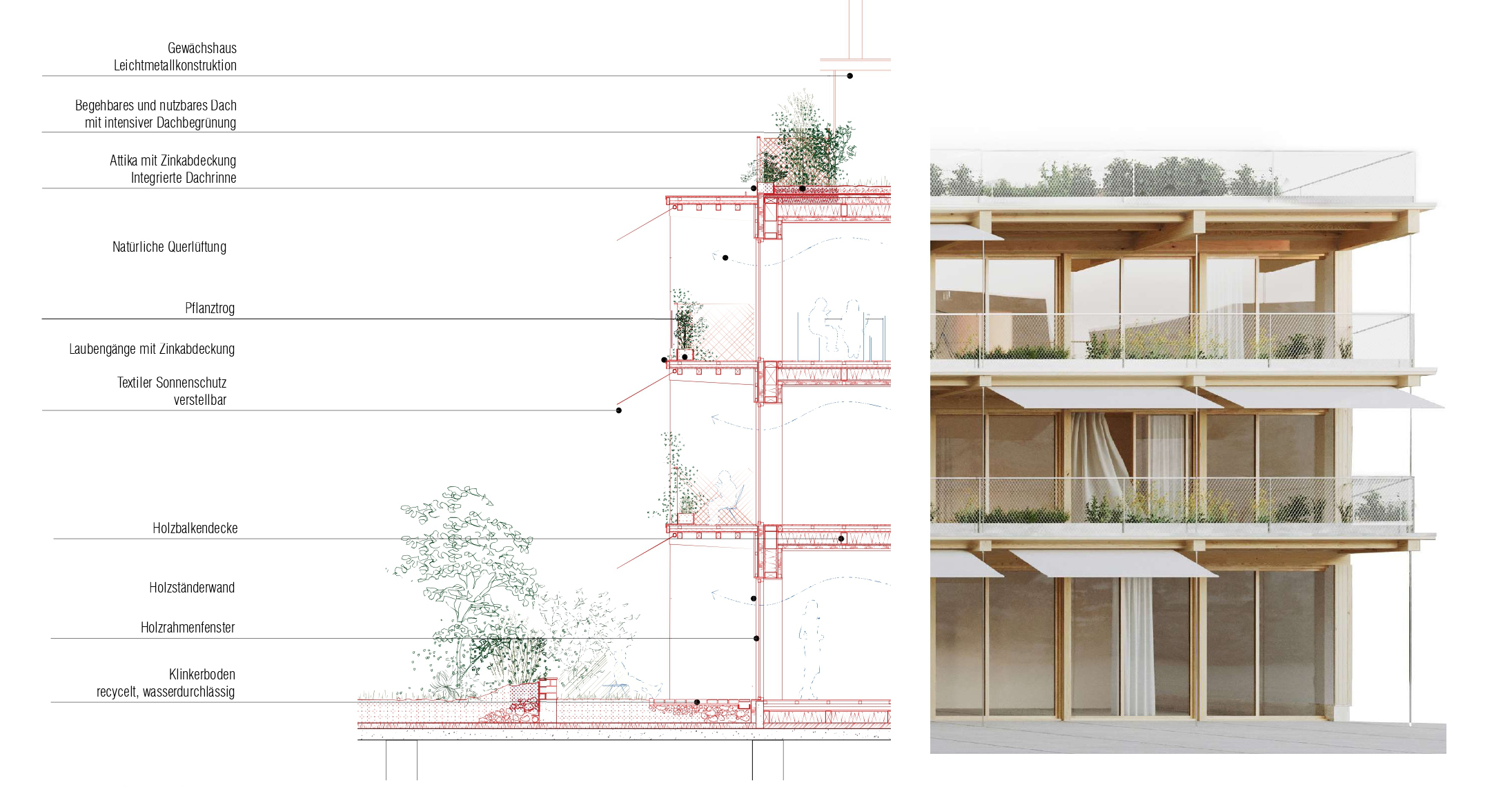 Das gesamte Projekt basiert auf Prinzipien ökologischer Nüchternheit: Holz-Beton-Konstruktionen, recycelte Materialien, alternatives Regenwassermanagement nach dem Vorbild der „Schwammstadt” und Sonnenschutz.