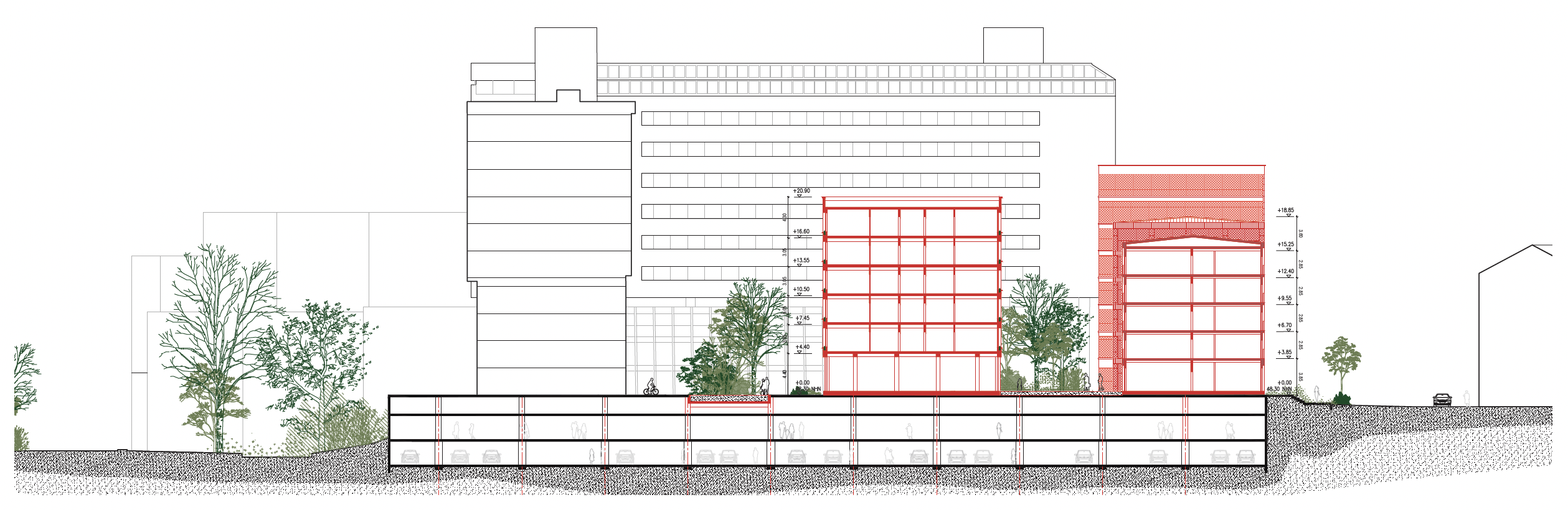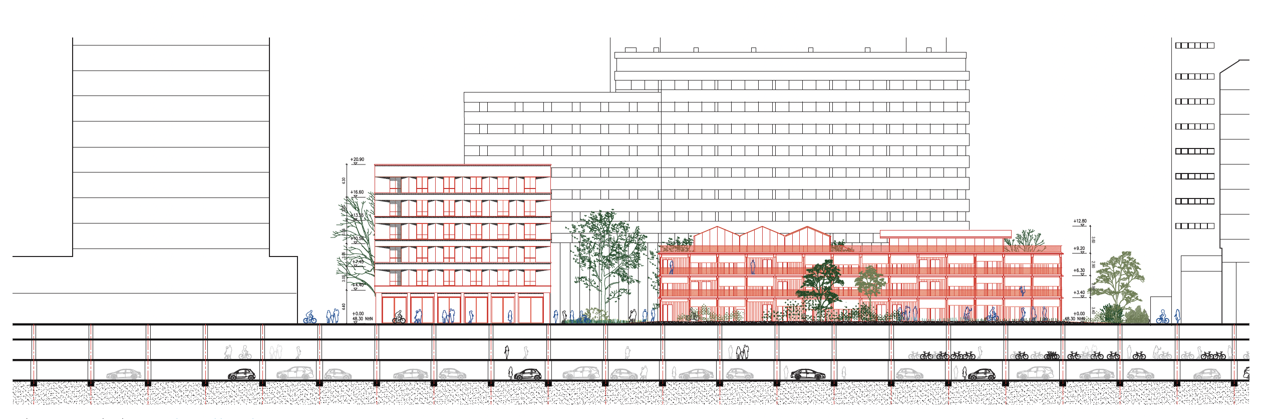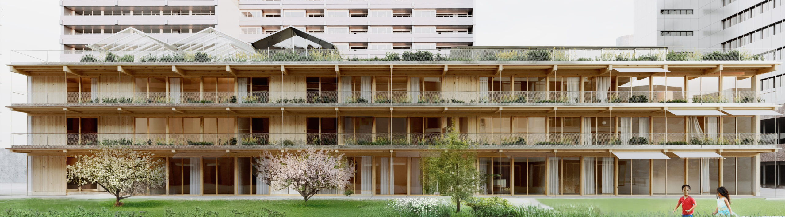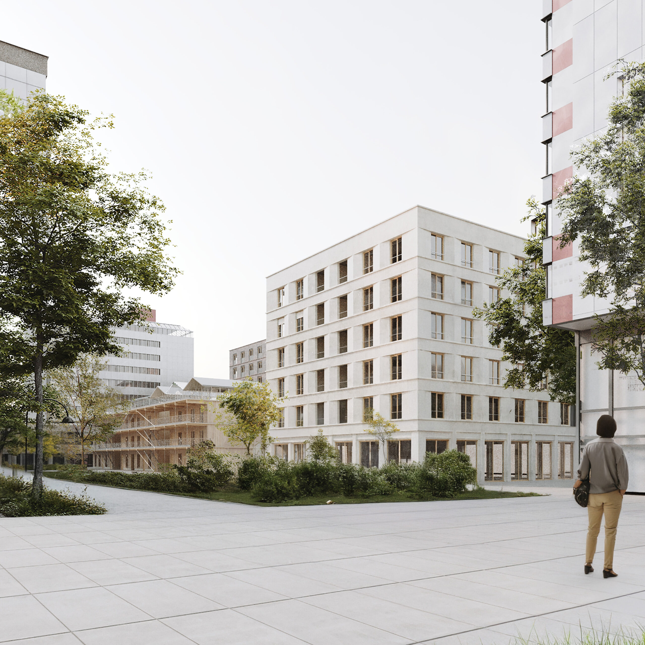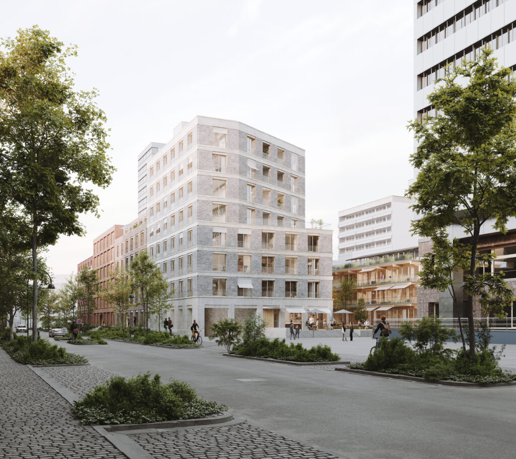 The development is based on principles of ecological sobriety: wood-concrete constructions, recycled materials, alternative rainwater management based on the ‘sponge city’ model, and controlled sunlight exposure.